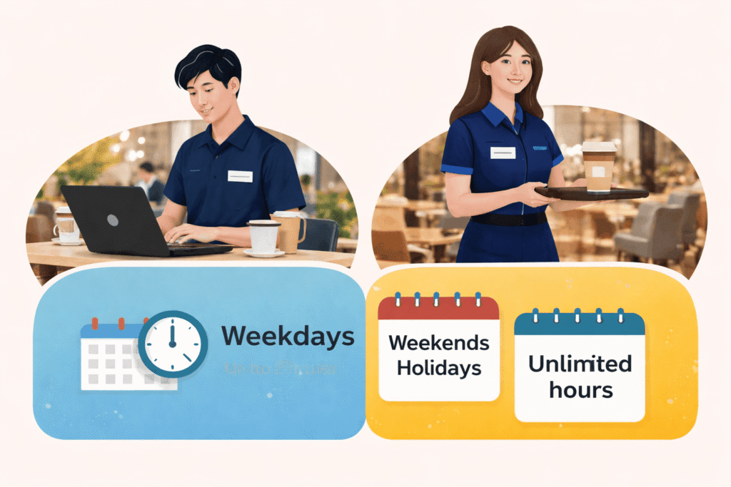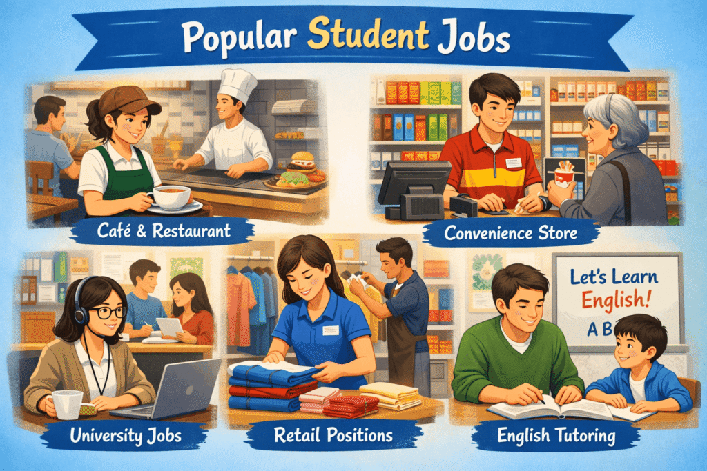 Common roles include cafés, restaurants, convenience stores, university support jobs, retail positions, and English tutoring.