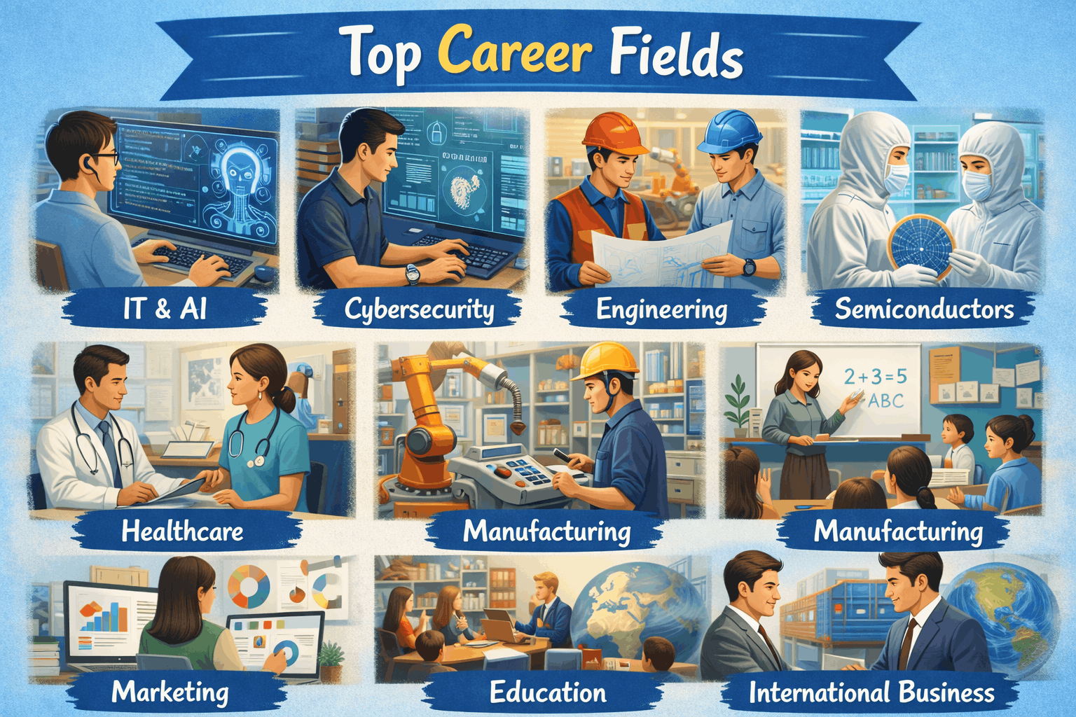 IT, AI, cybersecurity, engineering, semiconductors, healthcare, manufacturing, education, marketing, and international business are strong sectors.