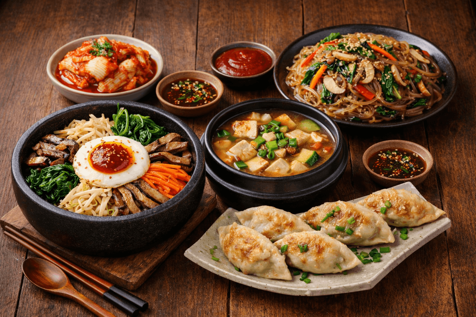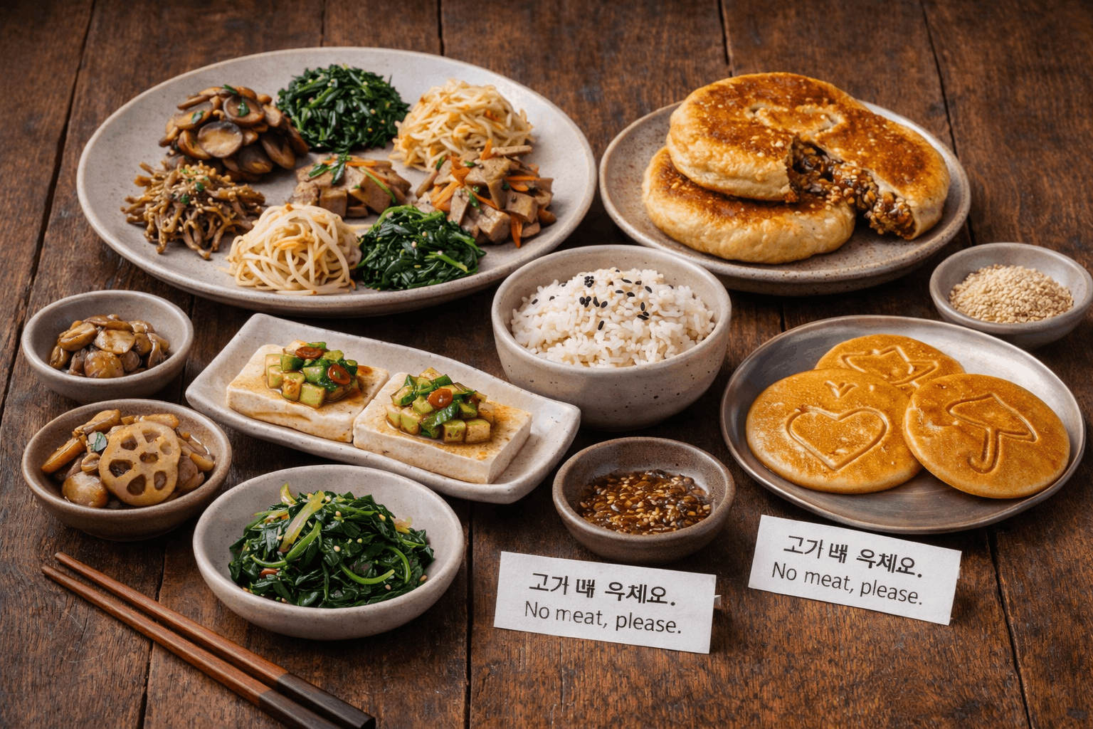 Korean cooking commonly uses sesame oil, soy sauce, chili paste, fermented soybean paste, vinegar, and black bean paste. Since some dishes may include fish sauce or meat broth, vegetarians should always request no fish and no meat when ordering.